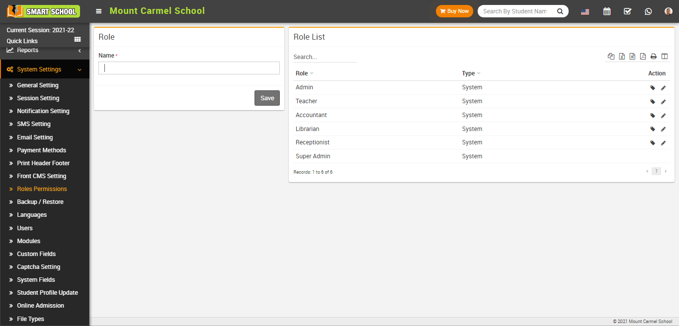 To add roles, go to System Settings > Roles Permission then enter role Name and then click on Save button. You can view this added record in the Role List on the right side of the page.