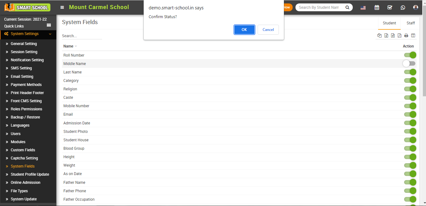 To disable system field, go to System Settings > System Field. Here you can see all enabled field. You can enable/disable any system field in student and staff.