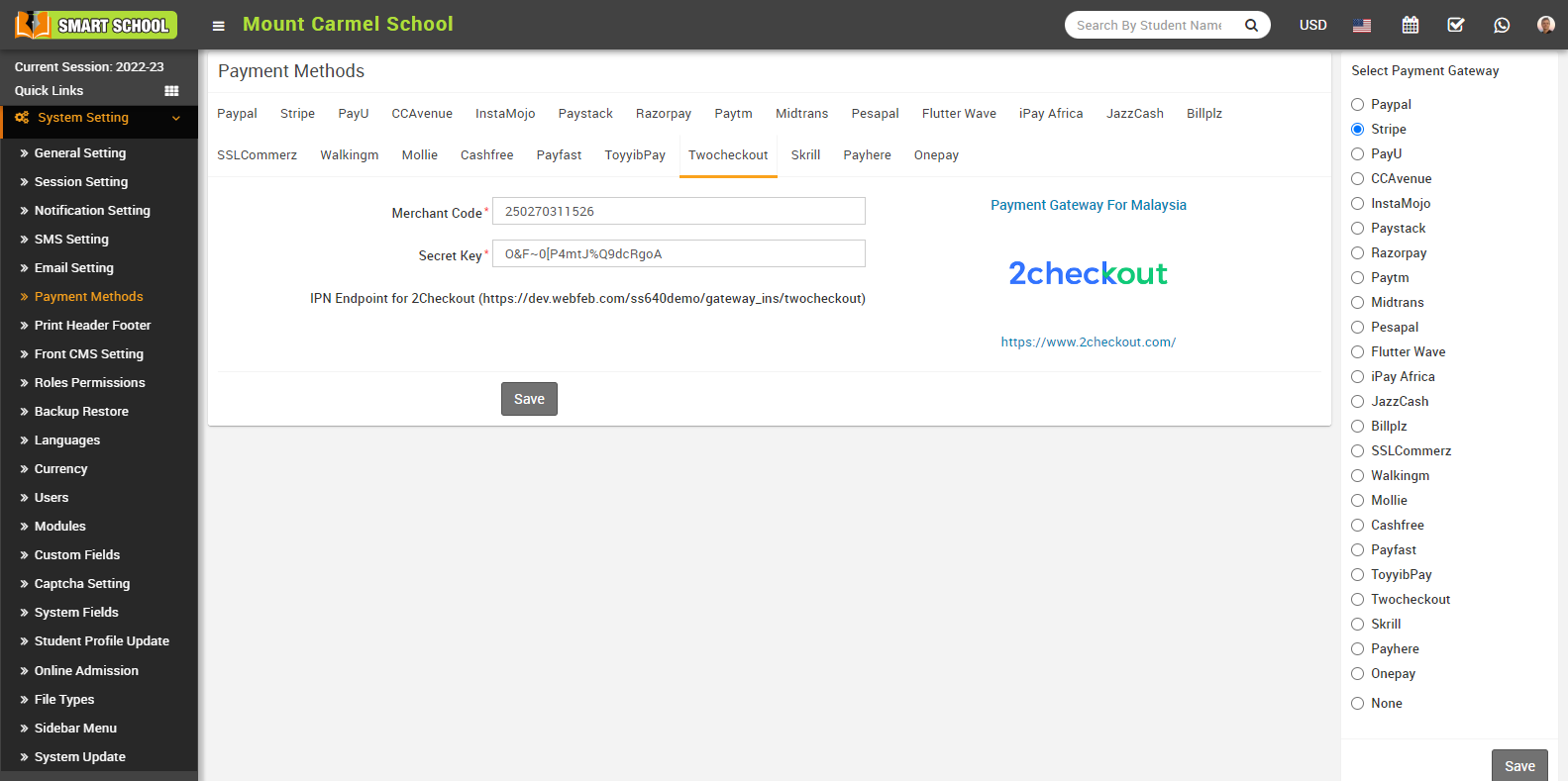 For allowing Students/parent to pay their payment online then you must have to enable any one of payment gateway, for this go to System Settings > Payment Methods then select any payment method from top of the page then enter your payment gateway account details in required fields then click on the Save button.