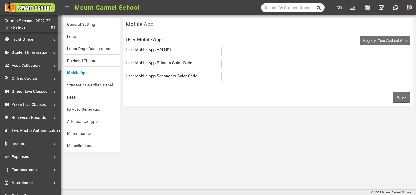 Now enter User Mobile App API URL, User Mobile App Primary Colour Code and User Mobile App Secondary Color Code then Click on Save button.
