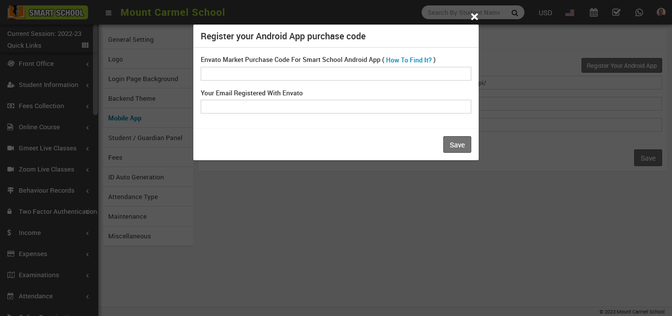 For register mobile app click on Register Your Android App when you will click on it pop window of Register your Android App purchase code will be open, here enter Envato Market Purchase Code For Smart School Android App ( How To Find It? ) and Your Email Registered With Envato then click on Save button.